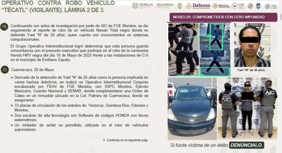 Asimismo, el funcionario detalló que Yael "N" cuenta con conocimientos en temas de informática, los cuales utilizaba para inhabilitar el localizador de los vehículos de lujo que eran robados.